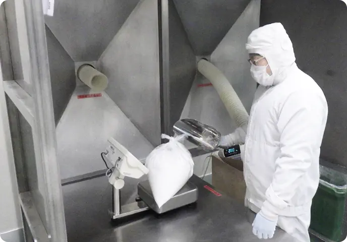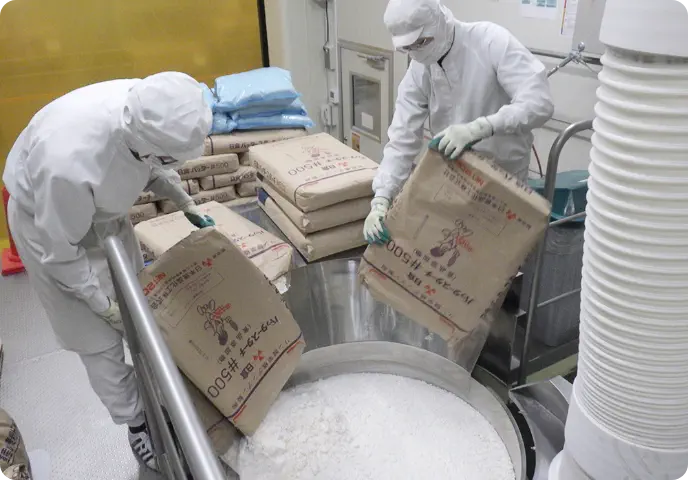 小麦粉を中心として、でん粉等の副資材を混ぜ、機能性をもたせたさまざまな製品を高品質・好環境にて製造しています。